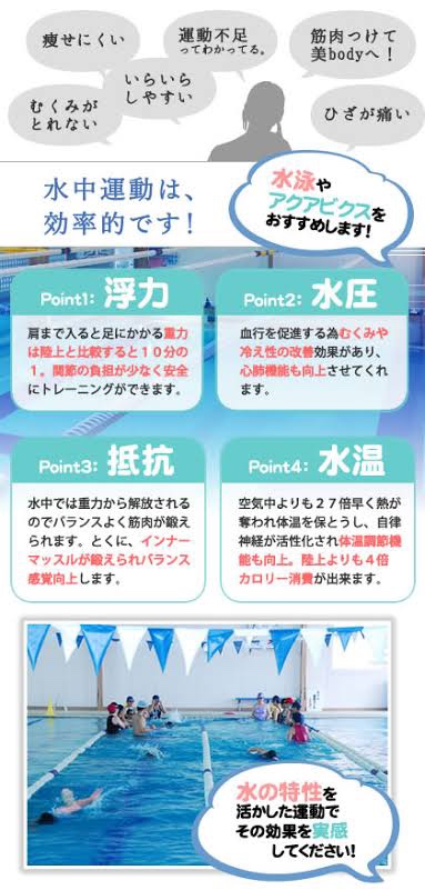 同じプールでの運動ですが、泳ぐのとはまた違う身体の使い方や水の効果を体感出来ます